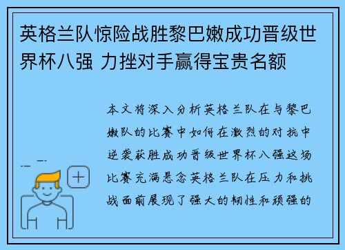 本文将深入分析英格兰队在与黎巴嫩队的比赛...